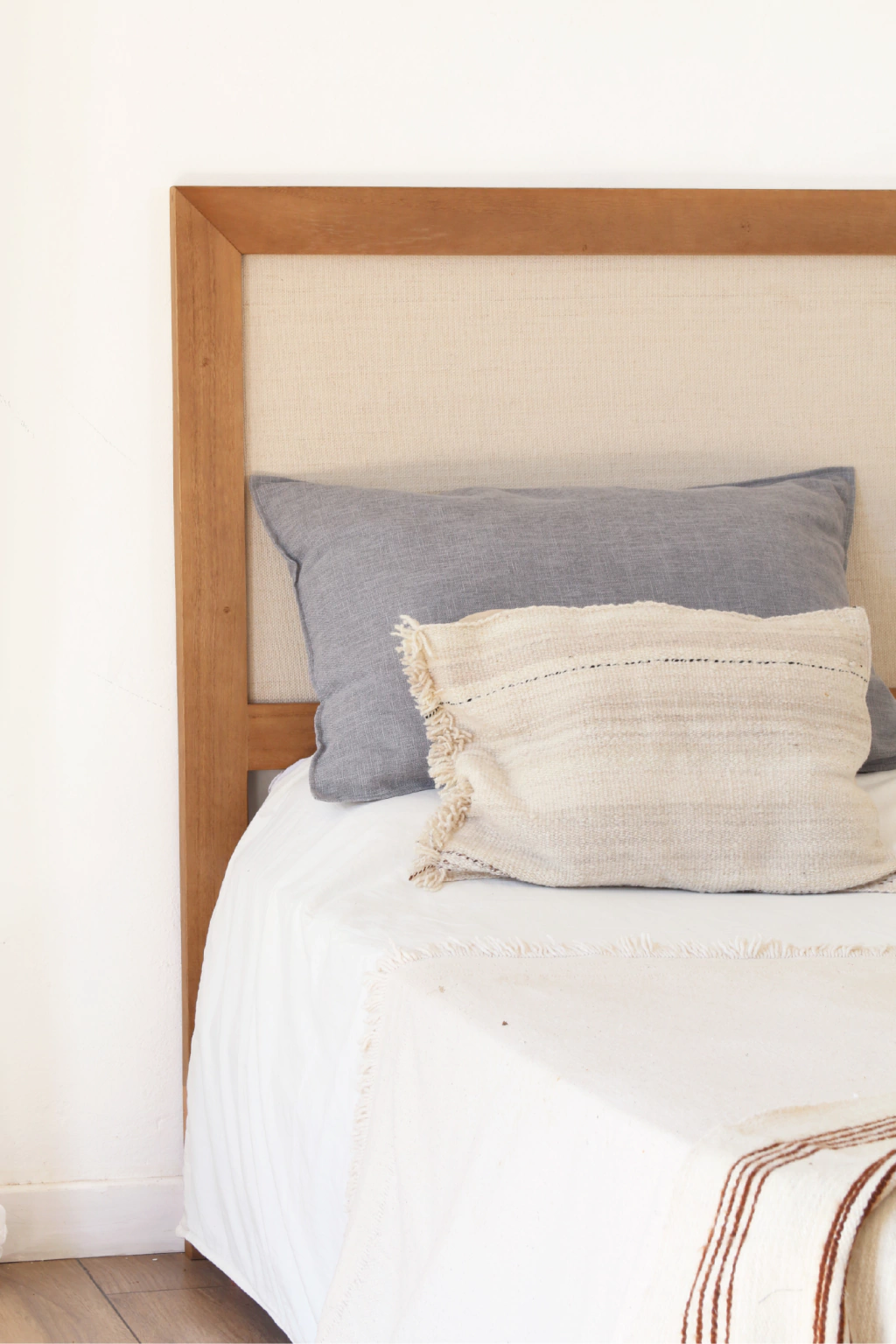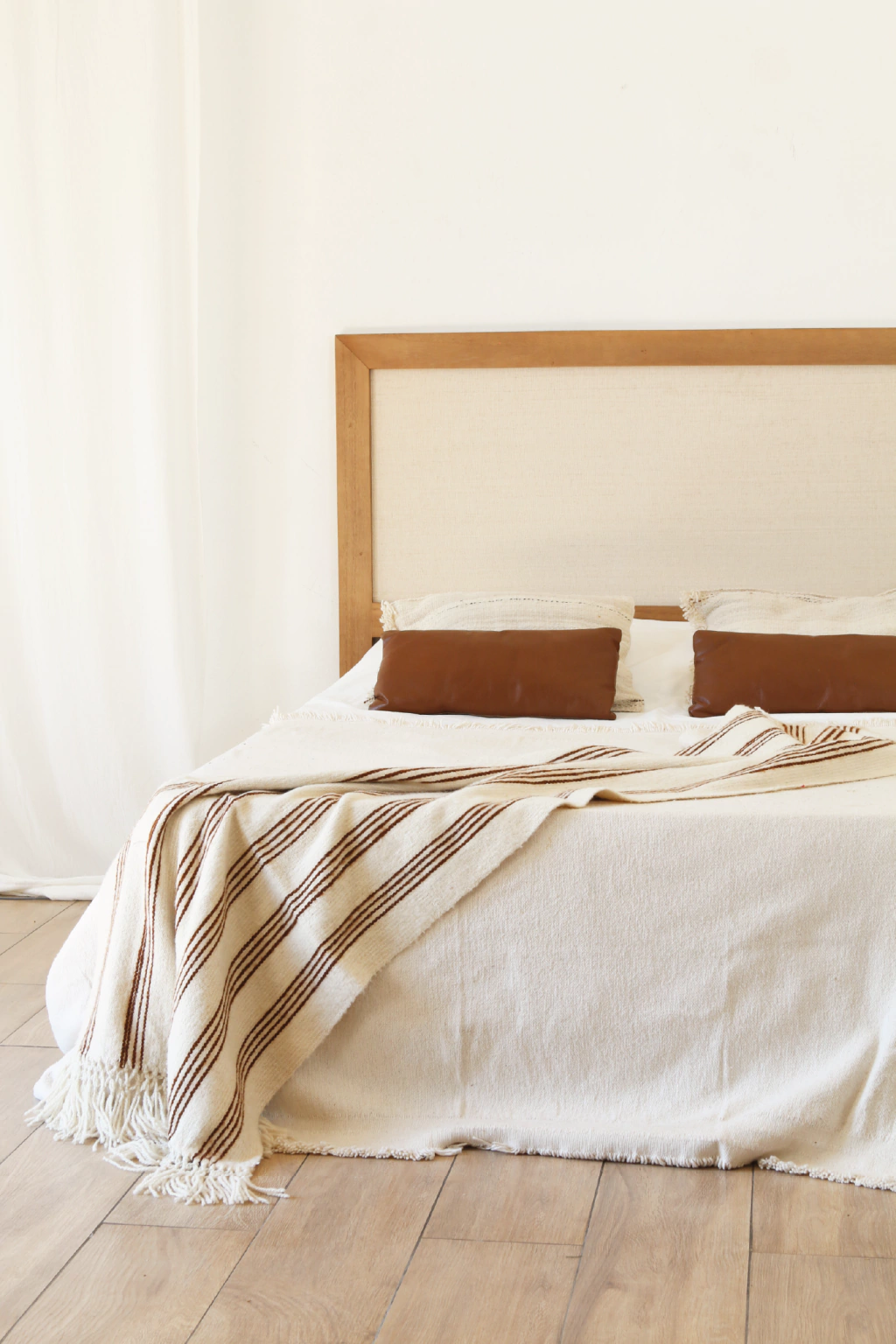 Fabricado en madera de kiri, ofrece durabilidad y un toque de luminosidad al dormitorio gracias a su interior de rafia natural. Su diseño recto y minimalista lo hace adaptable a diversos estilos, desde ambientes modernos hasta clásicos.